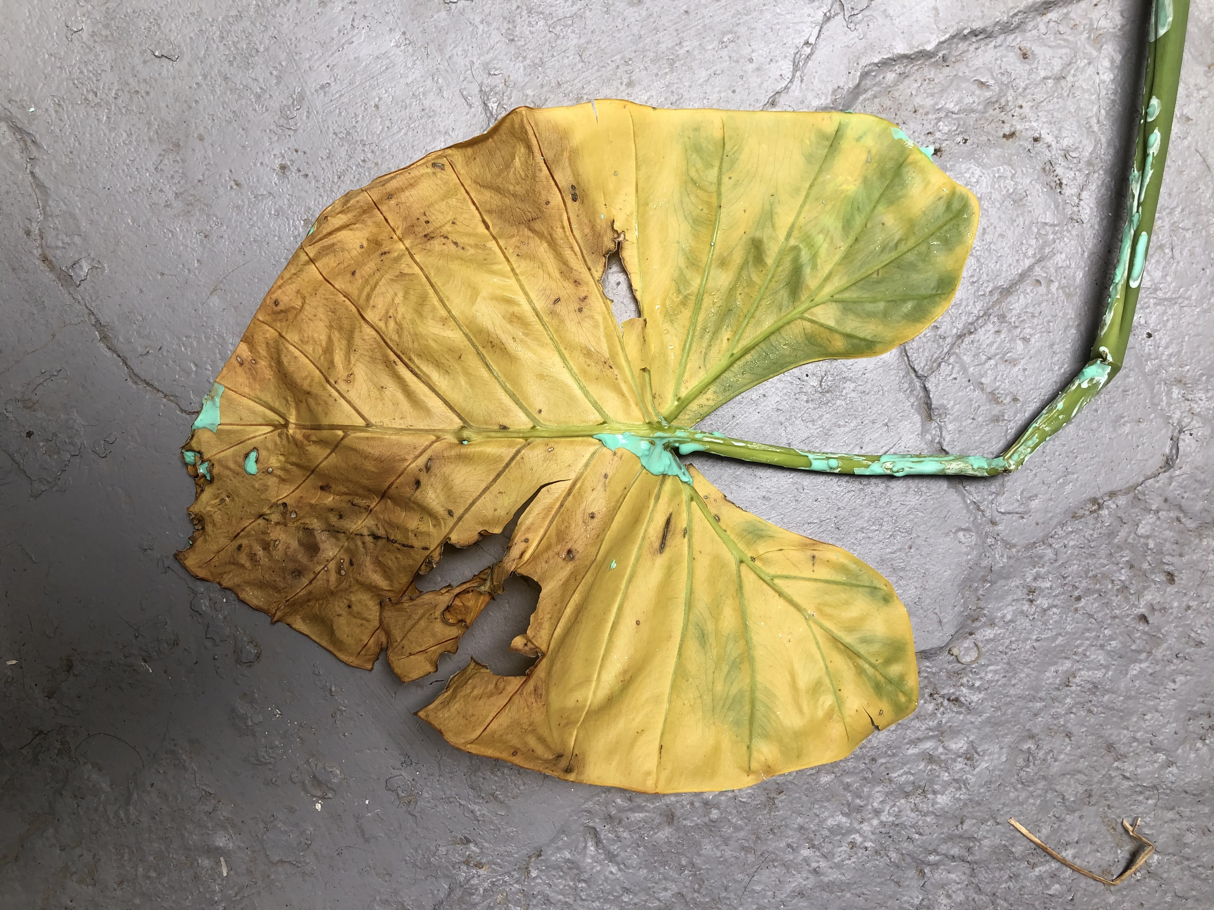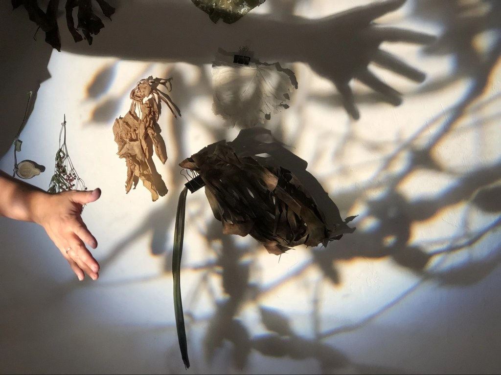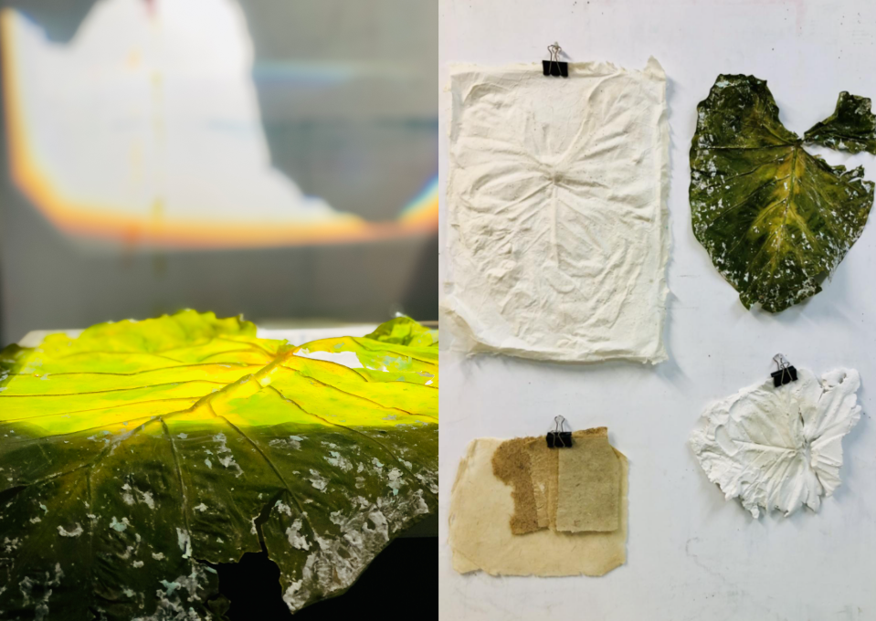 Cada una de las piezas genera una copia en sobre-relieve y a escala real de una hoja de la planta » Colocasia esculetum», y son concebidas por la necesidad de reflexionar sobre la huella vegetal y el ciclo de vida de la propia materia, la celulosa. Los materiales y materias primas utilizadas son respetuosas con el medio ambiente.