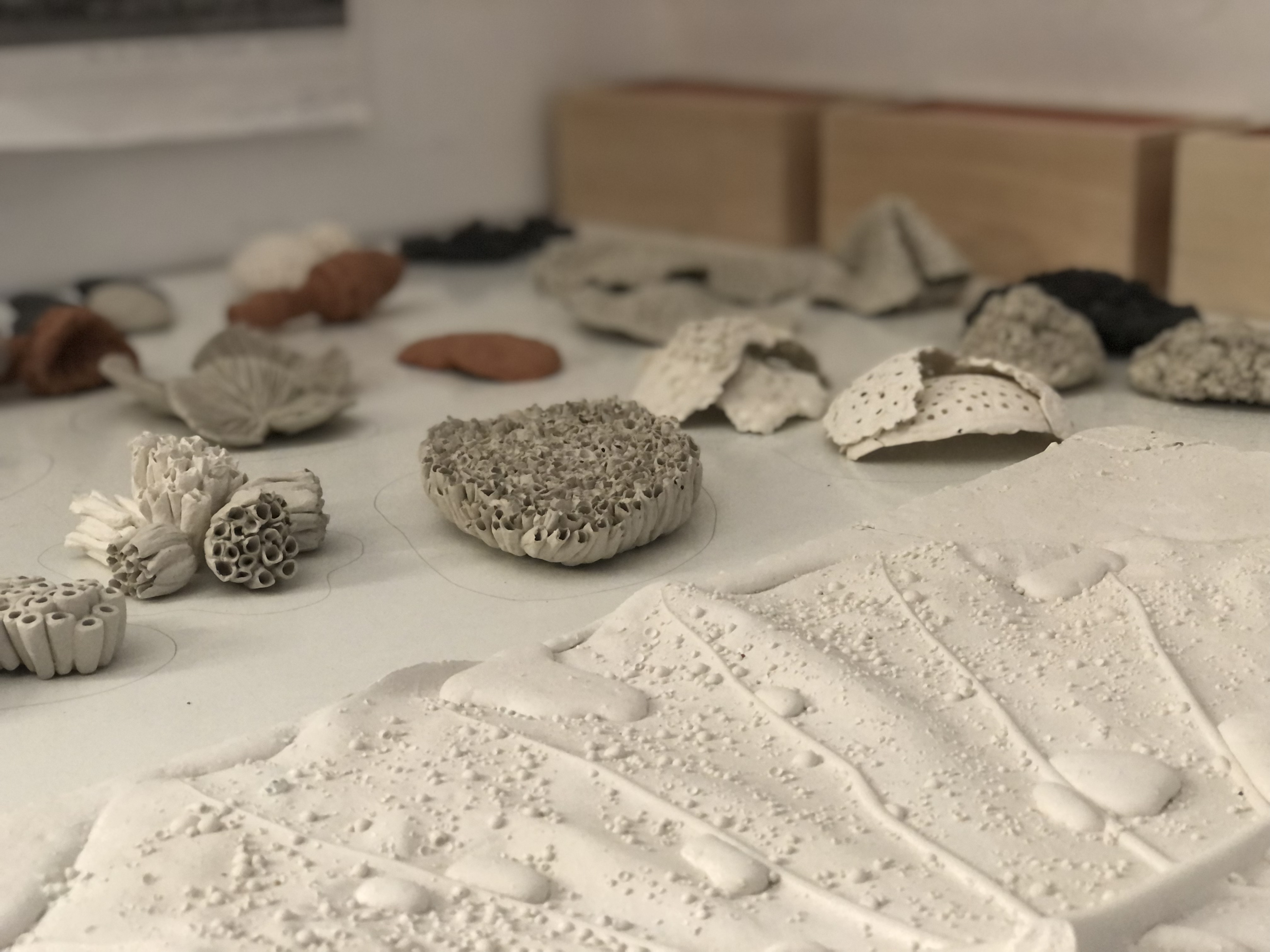 Las piezas, creadas en barro sin cocer, quieren dar un valor infinito a la materia y podrían volver a alimentar el ciclo natural sin alterar los ecosistemas. La escala de cada una, no supera el tamaño de la mano humana, con la finalidad de poder mantener la relación y conexión de escalas, y así, poder pensar desde el cuerpo la relación que establecemos como especie con otros seres vivos. En el proceso surgen diversas formas vivas e inertes que crean un micro paisaje.