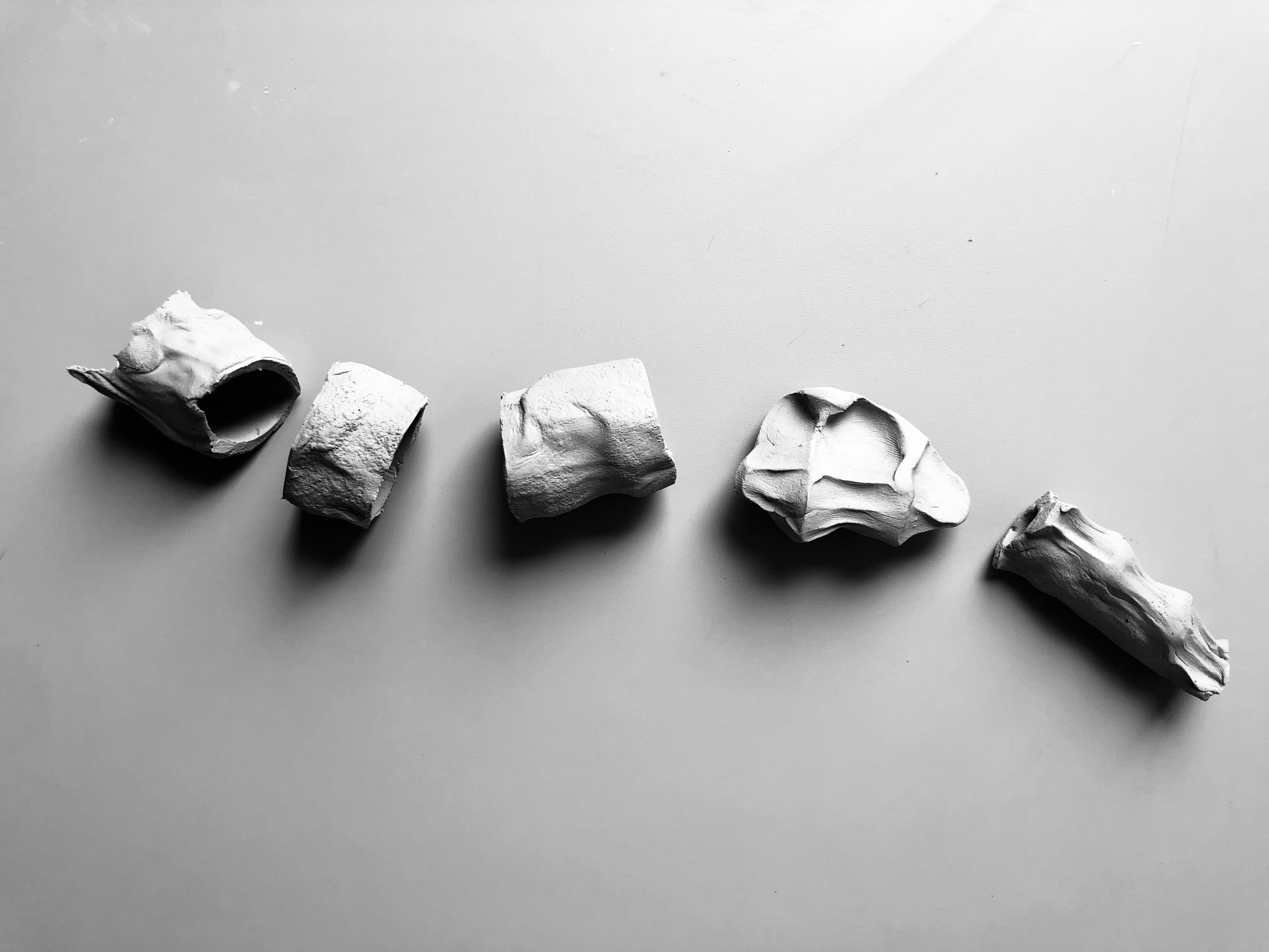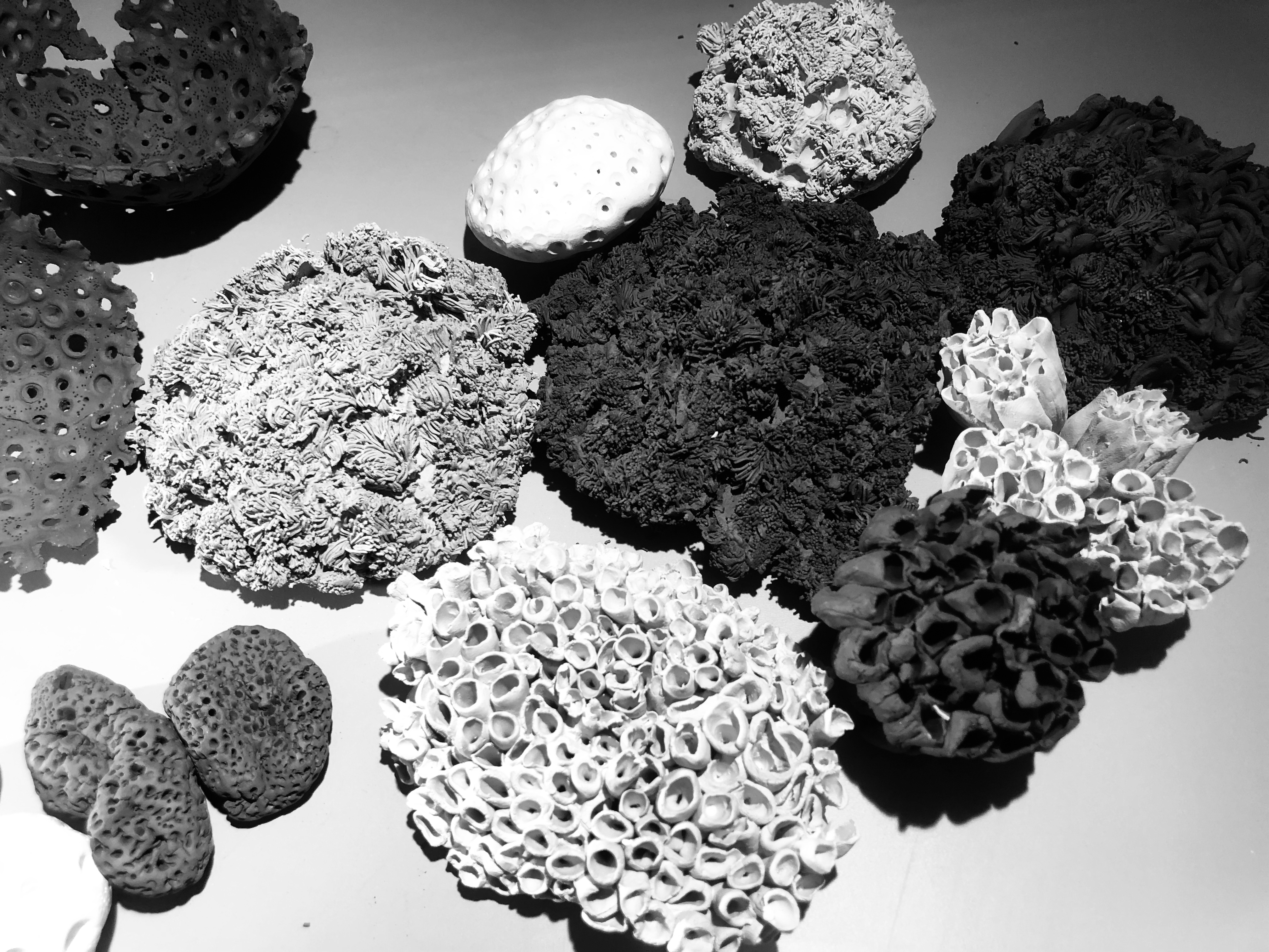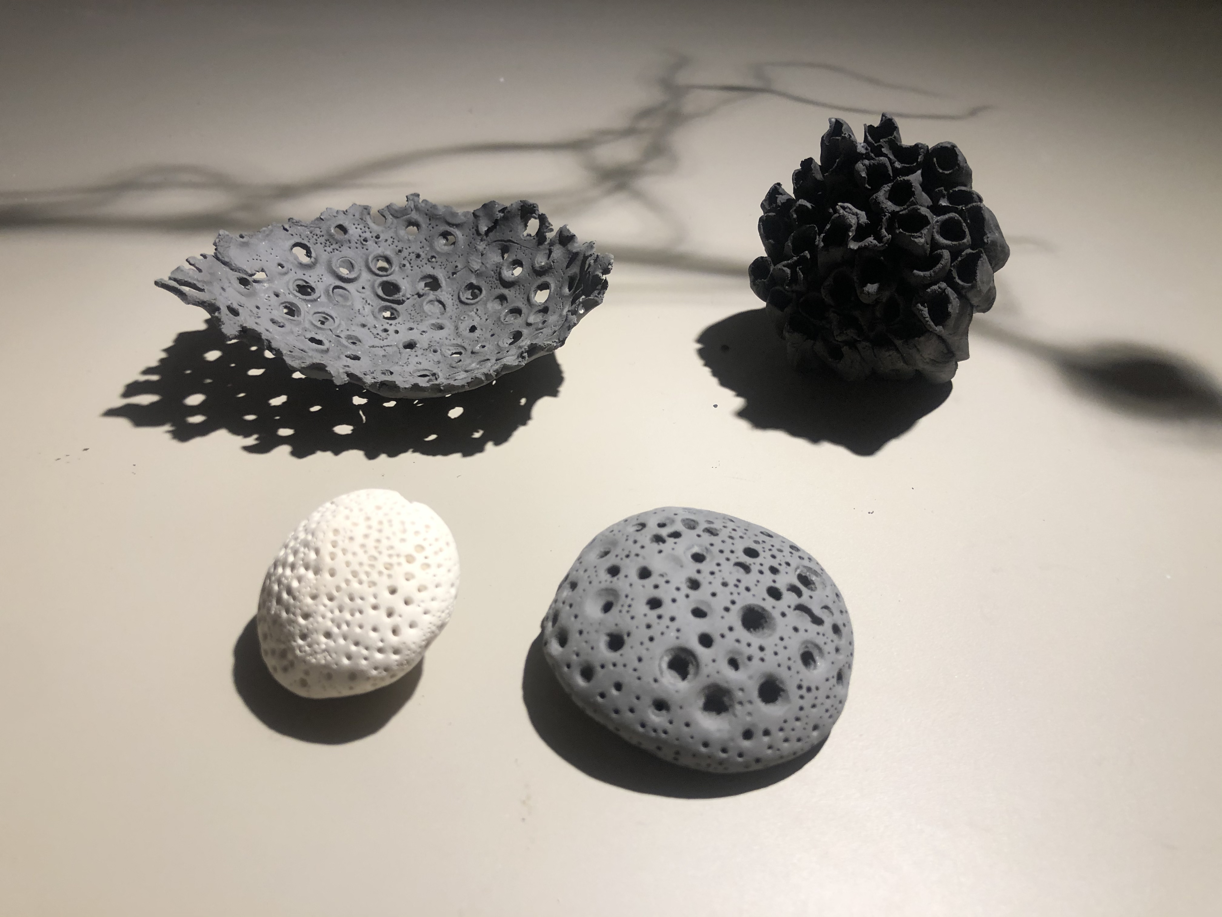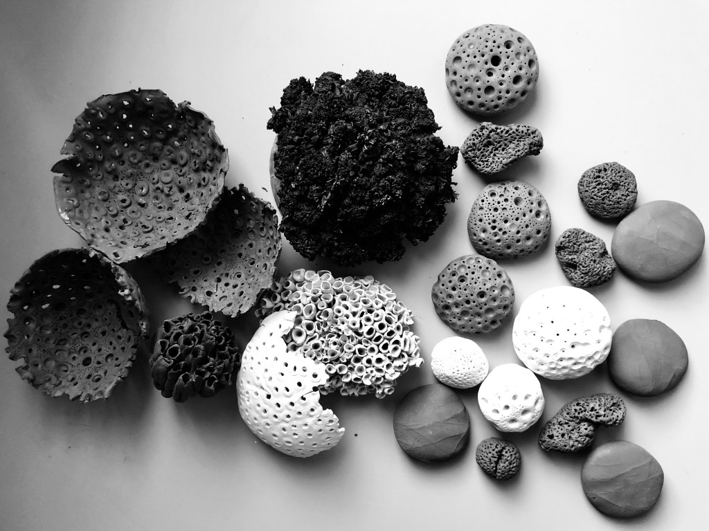 Cada una de las piezas creadas a mano nacen de mi memoria sensorial. Quieren reproducir, sin ser una copia, las formas amorfas, orgánicas de la naturaleza. Exploro formas y texturas a partir de pequeños gestos, utilizando mis manos como referencia de escala y como herramienta básica. El barro se transforma y reproduce, sin querer imitar, hongos, lìquenes, esponjas, corales, semillas, rocas, huesos …