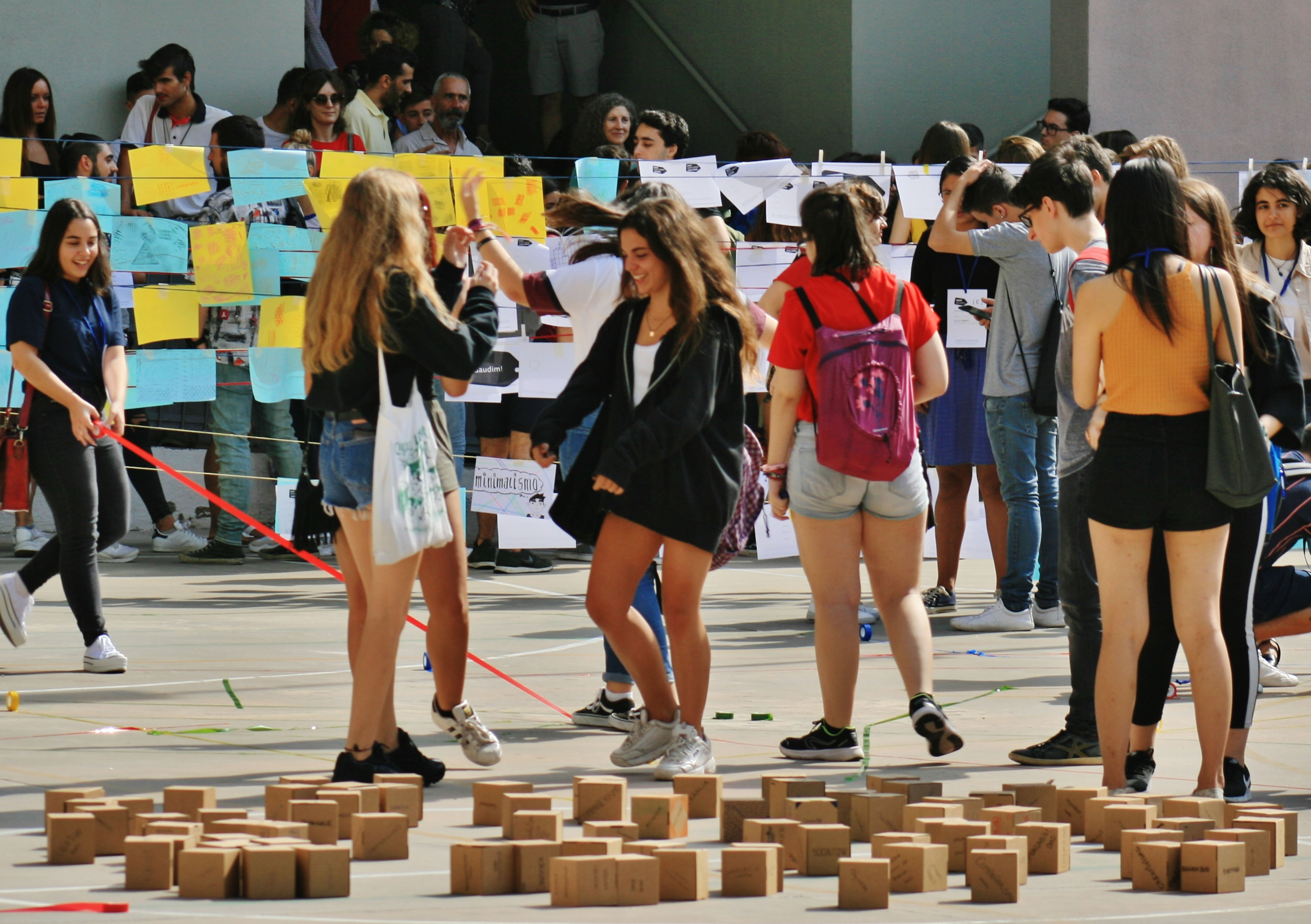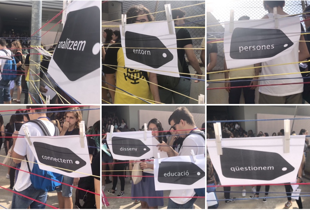 Durante la jornada co creativa grupos de alumnos/as de diferentes cursos, acompañados por tutores/as (profesores/as) reflexionan activamente y colectivamente entorno a conceptos relacionados a «la función de la escuela en la sociedad actual», «el diseño como una herramienta para la transformación social» y «la función del diseño en el futuro» para finalizar compartiendo los procesos de cada grupo con una acción co creativa.